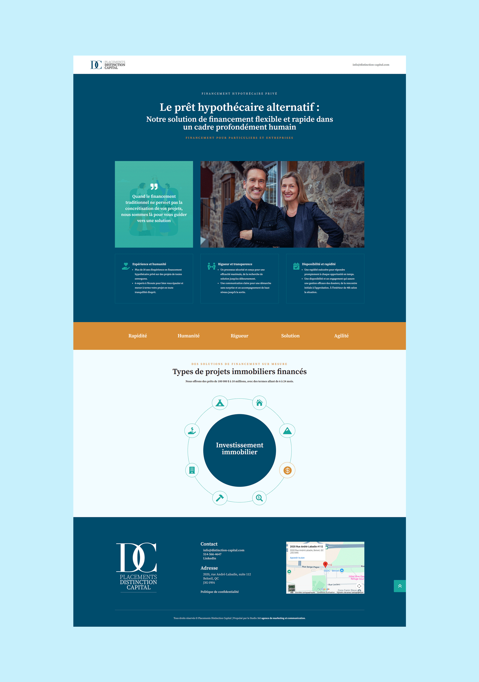 Placements Distinction Capital est une entreprise de financement immobilier alternatif cumulant plus de 20 ans d’expérience. Sa mission est d’offrir une alternative rapide, agile et complémentaire aux solutions offertes par les institutions financières traditionnelles. C’est grâce à son approche profondément humaine et rigoureuse que l’équipe transforme les défis en opportunités, permettant ainsi aux particuliers ou aux entreprises de se développer, de rebondir ou de réaliser pleinement leurs objectifs.